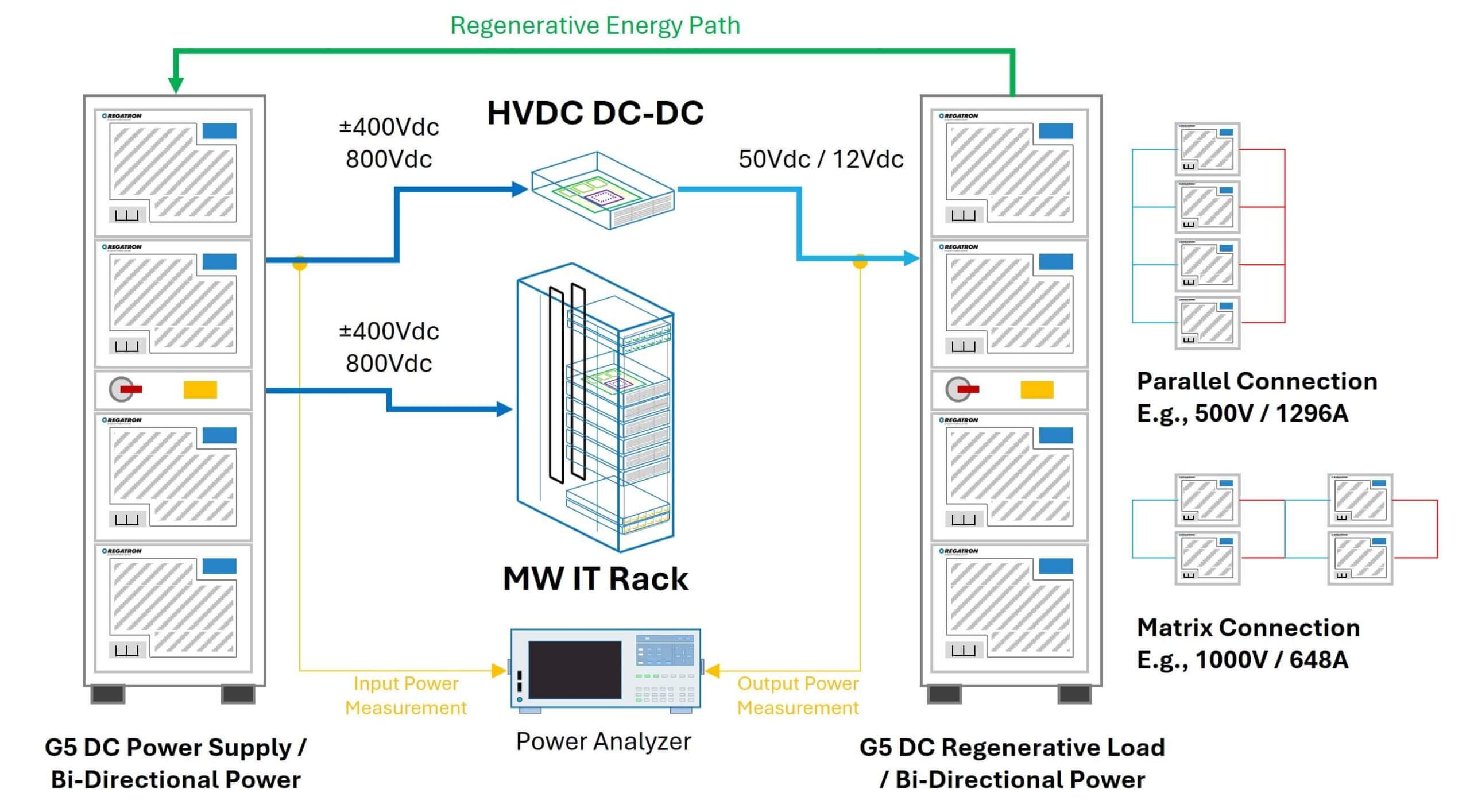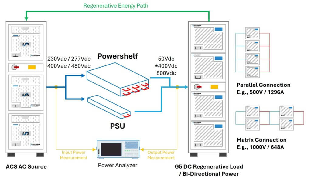 在 7×24 小时不间断测试运行中,能耗是最主要的运营成本。REGATRON 瑞士瑞佳通回馈式技术可将测试过程中高达 95% 的电能回收并回输至机房电网。