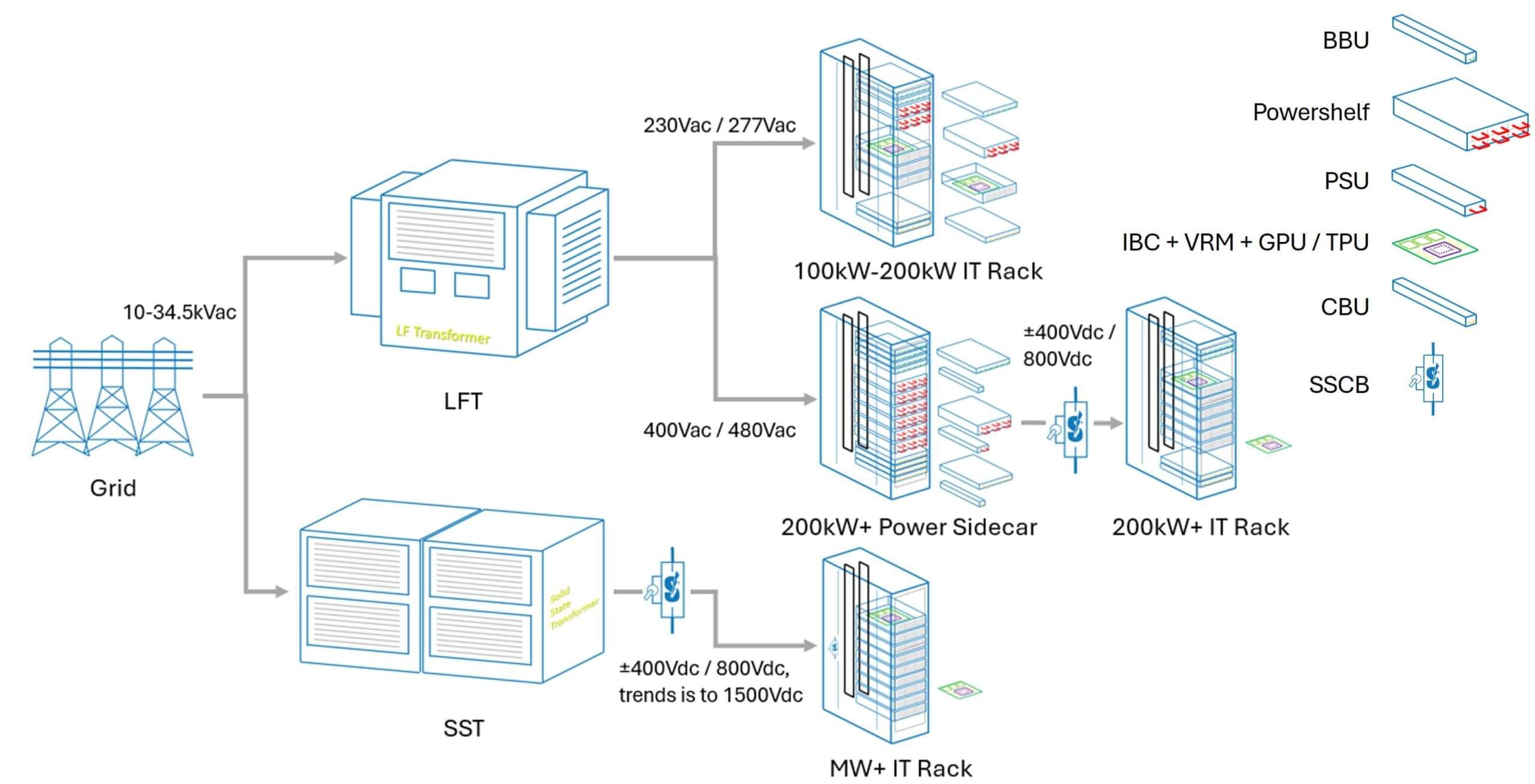 全面的总体拥有成本(TCO)分析证实:与传统风冷耗散型负载高昂的用电及冷却成本相比,该高效方案可显著加快投资回报周期(ROI),同时降低环境影响。为支撑下一代 AI 智算中心,电力基础设施正通过三个明确阶段演进,以高效应对持续增长的 GPU/TPU 能耗需求: