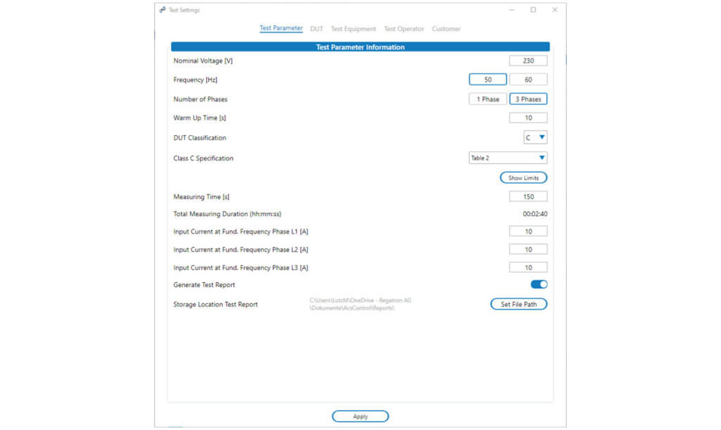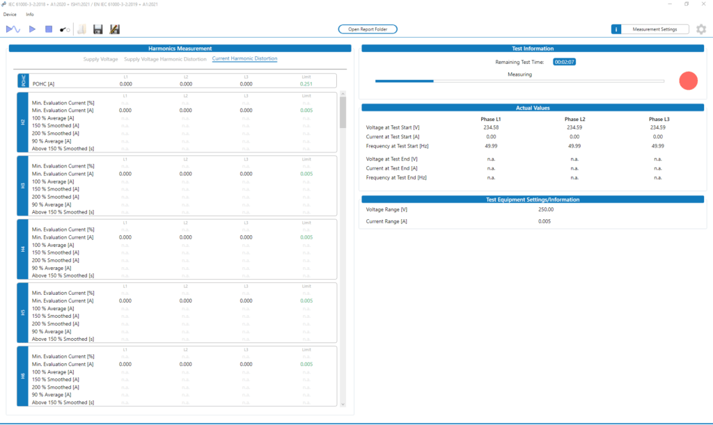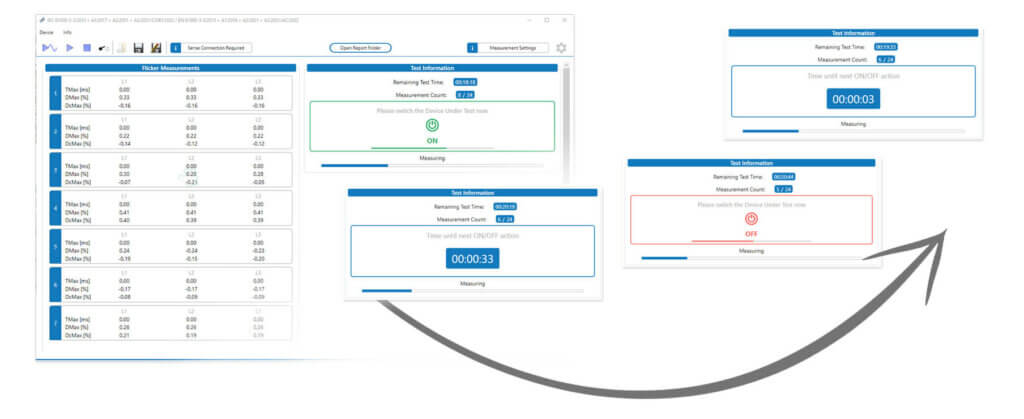 全新的手动开关被测设备测试向导(符合 IEC/EN 61000-3-3 附录 B 标准)可引导操作人员分步完成整个测试流程。根据标准中的定义,电压波动及其持续时间将在 24 个测量区间内完成测定。这一设计省去了对短期和长期闪烁进行额外评估的步骤。测试结束后,测量数据将按照标准要求进行处理:系统会筛选出最优与最差测量值,利用剩余数据计算评估所需的平均值,并自动生成测试报告。
